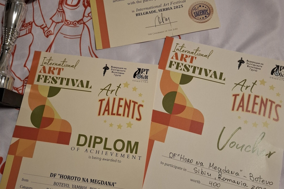 Танцова формация „Хоро на мегдана“ (камерен състав) завоюва Втора награда, а ръководителката Татяна Йовчева бе удостоена със сертификат за принос към популяризирането на българския фолклор и ваучер от 400 евро. Групата получи и покана за участие във фестивала в Сибиу, Румъния през 2026 година.